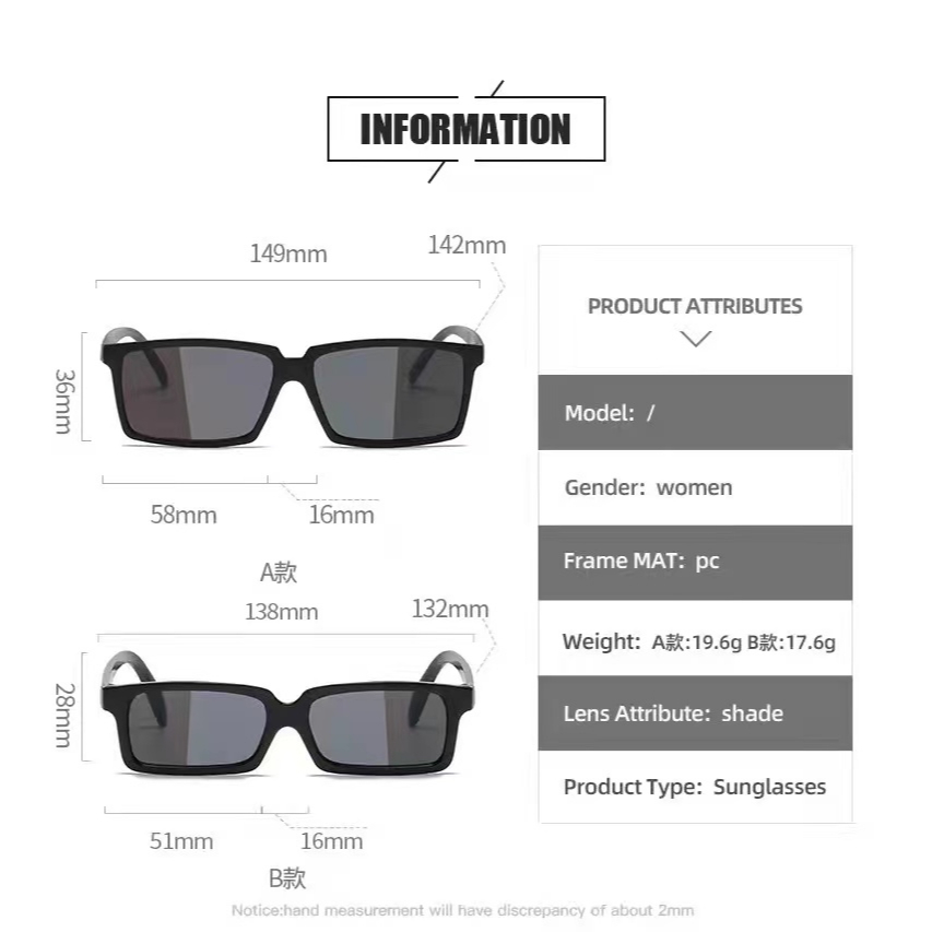 100% Baru dan Berkualitas Tinggi !!! Data Ukuran Kacamata Lebar total bingkai (mm) :149 Lebar lensa (mm) :51 Tinggi lensa (mm) :28 Lebar hidung (mm) :16 Panjang kaki cermin (mm) :142 Isi Paket: 1pc kacamata hitam
