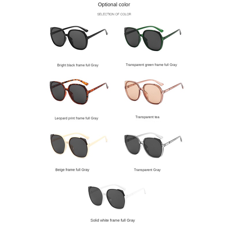 Lens color: bright black frame full gray, transparent green frame full gray, leopard pattern frame full gray, transparent tea, beige frame full gray, transparent gray, solid white frame full gray