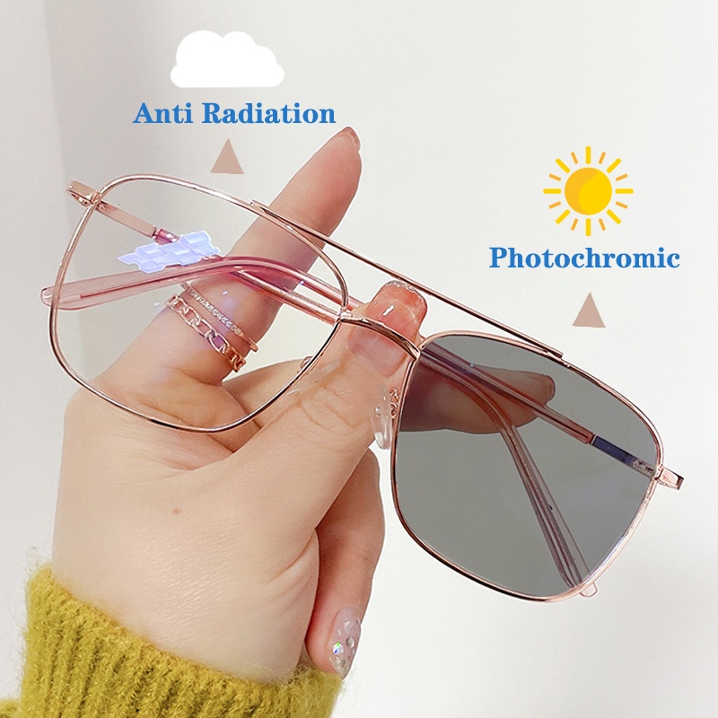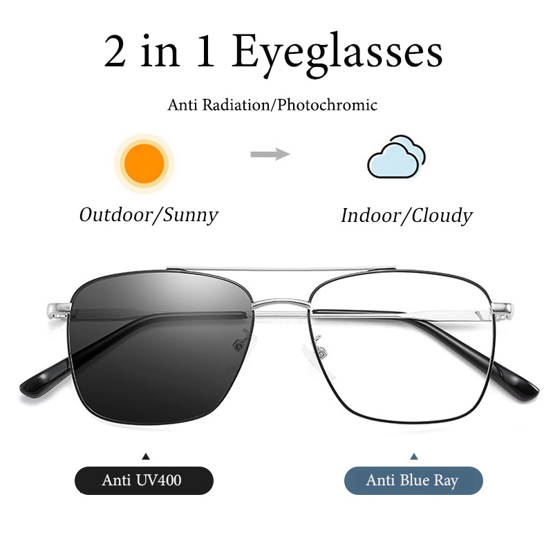 Aksesoris Fashion > Kacamata & Aksesoris > Frame & Lensa Kacamata > Kacamata Photochromic Anti Blue Beam Bentuk Kotak Bahan Metal Gaya Retro Untuk Pria