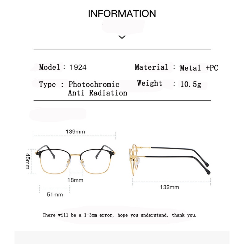 Spesifikasi: Spesifikasi: Spesifikasi: Nama: Kacamata Photochromatic 2 in 1 Berat: 10.5 g. Jenis Kelamin: Unisex Bahan Lensa AC Bahan Bingkai: baja tahan karat (Kami Mengirim dari China untuk memastikan pengiriman tepat waktu kepada Anda) Ukuran Produk: Ukuran Produk: Produk: Ukuran Produk: Ukuran Produk:: Lebar Bingkai: 139 mmmm Lebar Lensa: 51 mm Tinggi lensa: 45 mm Lebar jembatan hidung: 18 mmmm Panjang lengan: 132 mmmm Isi kemasan: 1 x kacamata ✅Kami telah menambahkan bahan baku anti radiasi ke dalam lensa sehingga lensa benar-benar transparan. ✅Lensa dapat anti radiasi tidak peduli apakah lensa photochromic atau tidak. ✅Sebelum mengirimkan pesanan Anda, kami akan melakukan pemeriksaan penuh, memastikan semuanya benar. ✅Perlindungan Penuh - Kacamata cocok untuk indoor dan outdoor. ✅Radiasi Anti Biru - menyaring sebagian besar radiasi biru, menjaga kesehatan mata Anda. ✅Mata Anti Lelah - Lensa kami dapat menghilangkan kelelahan mata terutama saat menonton TV dan bekerja di komputer. ✅Anti UV400 - dengan lensa UV 400, dapat 100% memblokir UVA berbahaya & Sinar UVB dari matahari. ✅Lensa Photochromic - lensa akan berubah warna secara otomatis saat terkena sinar matahari. ✅Ini adalah hadiah terbaik untuk orang yang menggunakan perangkat elektronik untuk waktu yang lama (siswa, pekerja kantor dll). ⚠️⚠️Kebijakan pengembalian Jika Anda menerima produk yang salah, kami dapat mengembalikan pesanan Anda atau mengirim ulang pengganti kepada Anda. Jika Anda menerima produk yang cacat, kami dapat mengembalikan pesanan Anda atau mengirim ulang pengganti kepada Anda. Tolong jangan tinggalkan ulasan buruk sebelum menghubungi kami, kami akan mencoba yang terbaik untuk memecahkan masalah Anda, terima kasih