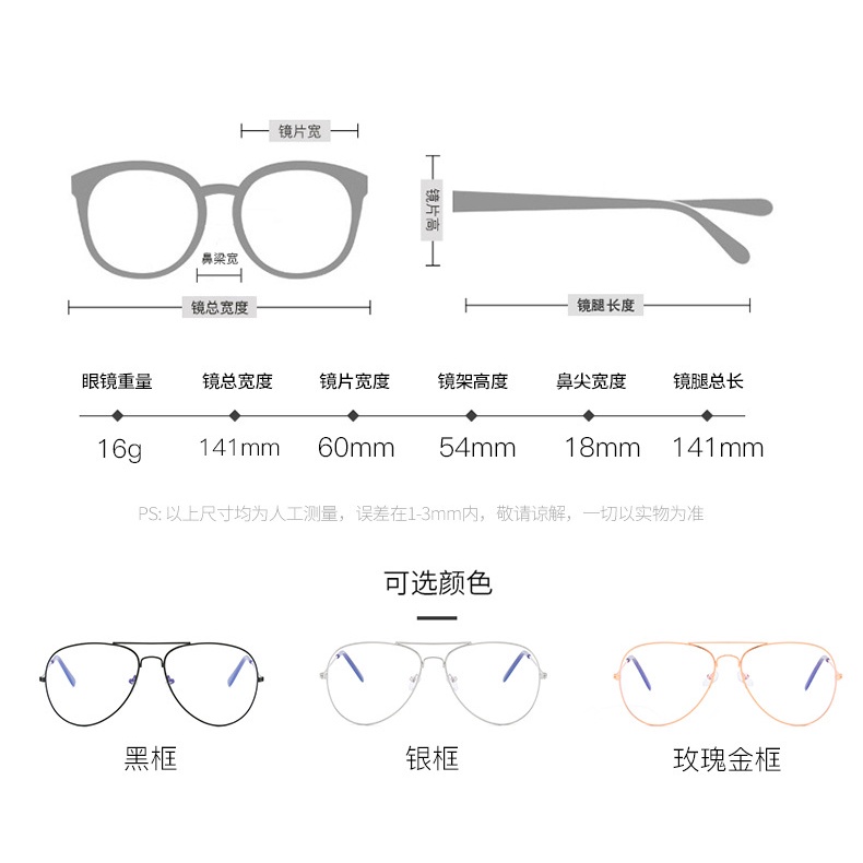 NOTICE: 1. The left and right lenses of the glasses have the same power. 2. Only plain glass spectacle are anti blue light or anti-fatigue.
