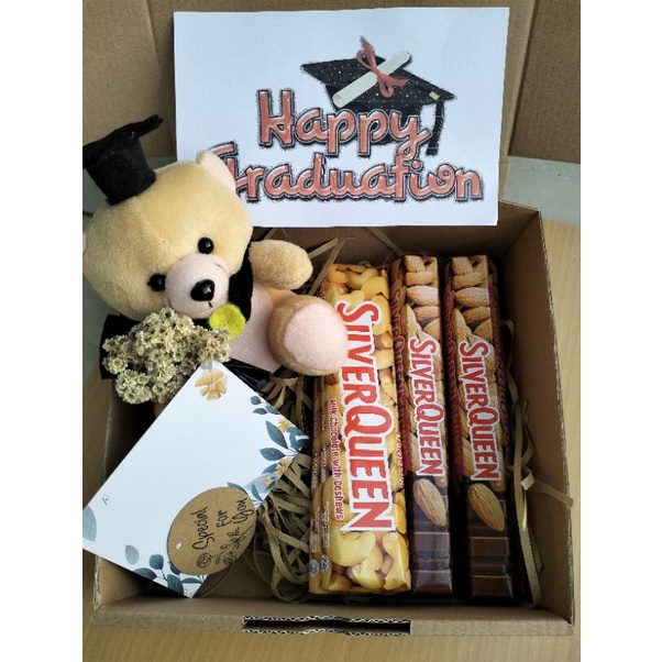 *coklat chunky 95 gr (2pc) *coklat silverqueen 62 gr (2 pc) *boneka toga 15cm (warna cream,coklat) *kartu ucapan (silahkan isi di catatan saat check out) *kertas cacah +box