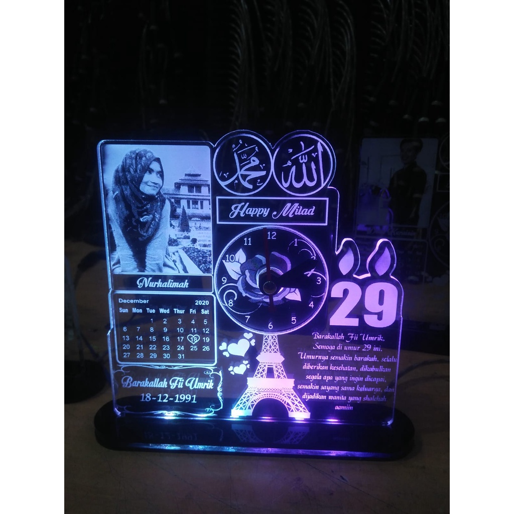 Lampu Hias Grafir Photo 1. Design Model Bebas tidak harus. sama seperti di contoh 2. Bahan akrilik bening tebal 4mm 3. ukuran 14x12cm 4.Pilihan Warna : Merah/Biru/Hijau/Putih/Pink/Kuning 5. Power : Adaptor 9 Volt 6. Holder + LED + adaptor 7. jam analog
