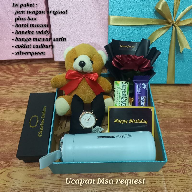* KETERANGAN PAKET : - JAM TANGAN ORIGINAL PLUS BOX NYA - BOTOL MINUM ( warna tergantung stok ) - BONEKA TEDDY UKURAN -+ 12CM - BUCKET BUNGA MAWAR BAHAN SATIN MEWAH - SILVERQUEEN MATCHA 25g - CADBURY 30g - KARTU UCAPAN ( BISA REQUEST) - BOX LUAR ADA 2 MACAM 1. BOX BIASA (LIHAT GAMBAR DIATAS) 2 HARD BOX (LIHAT GAMBAR DI ATAS) SILAHKAN PILIH BOX NYA DI VARIASI PRODUK