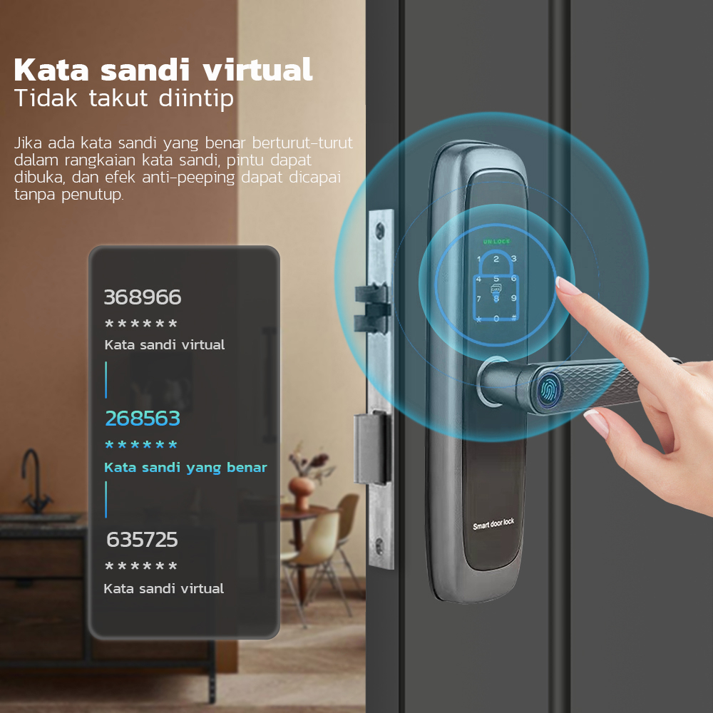 Dual sekuritas chip : enkripsi keamanan transmisi data Lubang kunci tersembunyi : menjaga buka paksa Elektronik indoor : Hanya admin yang bisa buka Jangan khawatir akan serangan black box : anti buka paksa Password palsu : anti intip privasi proteksu Angkat dan kunci gagang : operasi yang cukup mudah dalam satu step Tutup pintu dan kunci otomatis : Handle akan terkunci secara langsung