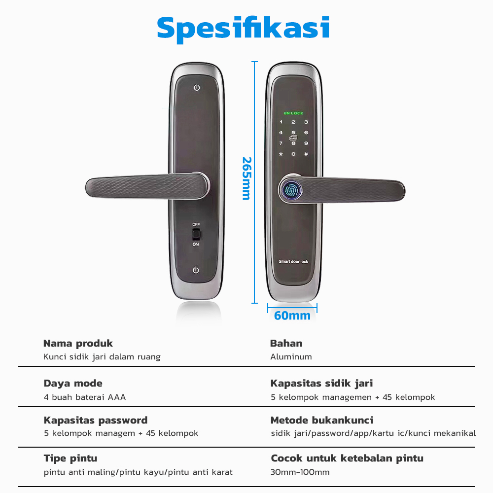 Parameter Produk: Nama produk : Kunci sidik jari dalam ruang Bahan : Aluminum Daya mode : 4 buah baterai AAA Kapasitas sidik jari : 5 kelompok managemen + 45 kelompok Kapasitas password : 5 kelompok managem + 45 kelompok Metode bukankunci : sidik jari/password/app/kartu ic/kunci mekanikal Tipe pintu : pintu anti maling/pintu kayu/pintu anti karat cocok untuk ketebalan pintu:30mm-100mm