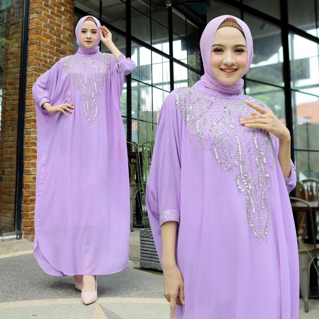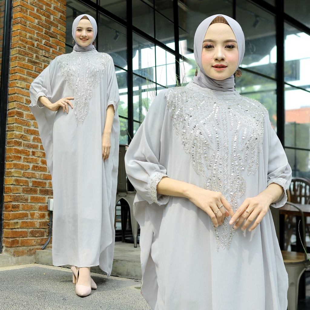 Kaftan terbaru calista dengan bahan premium yang cantik, dengan aplikasi batu-batu combi manik-manik jahitan tangan. terlihat sangat mewah di bahan + ada tali didalam untuk mengikat kebelakang ๐๐๐๐๐