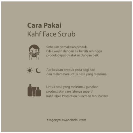 Cara Pemakaian: 1. Sebelum pemakaian produk, bilas wajah dengan air bersih sehingga dapat diratakan pada wajah 2. Gunakan pada pagi dan malam hari untuk hasil yang maksimal 3. Bila tidak ada jerawat aktif, dapat digunakan setiap hari 4. Untuk hasil yang maksimal, kombinasikan penggunaan dengan produk lain seperti Kahf Face Wash dan Kahf Tripe Protection Sunscreen & Moisturizer