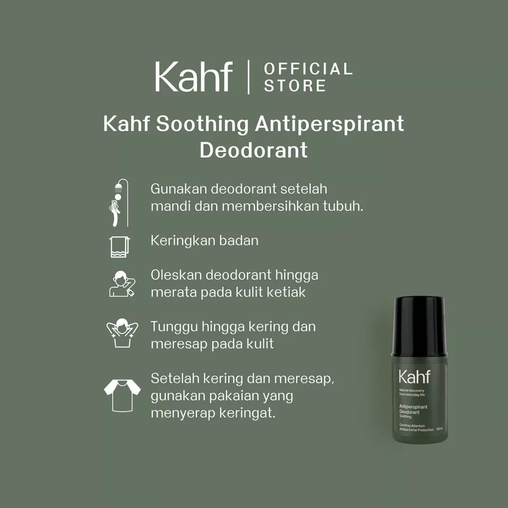Kahf Soothing Antiperspirant Deodorant merupakan deodorant yang dilengkapi dengan perlindungan antibakteri alami untuk menjaga tubuh dari bau badan dan keringat hingga 48 jam tanpa menimbulkan noda pada pakaian. Dikembangkan dengan Comfrey allantoin sehingga terasa nyaman saat digunakan dan terbukti secara dermatologis tidak menimbulkan iritasi.