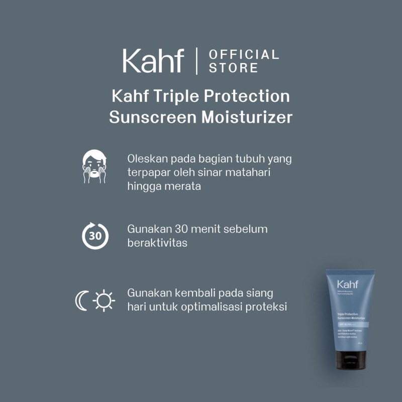 Kahf Triple Protection Sunscreen Moisturizer adalah pelembap wajah pria dengan tekstur yang ringan, mudah menyerap, serta tidak membuat kulit terasa lengket. Dilengkapi dengan Skin-Deep Moist™ Actives yang dapat memberikan kelembapan pada kulit serta kadar SPF 30 & PA +++ yang dapat memberikan perlindungan pada kulit dari paparan sinar matahari berlebih dan polusi. Diperkaya dengan ekstrak Japanese Mugwort mampu menjaga kulit dari radiasi sinar Blue Light yang dipancarkan dari perangkat digital.