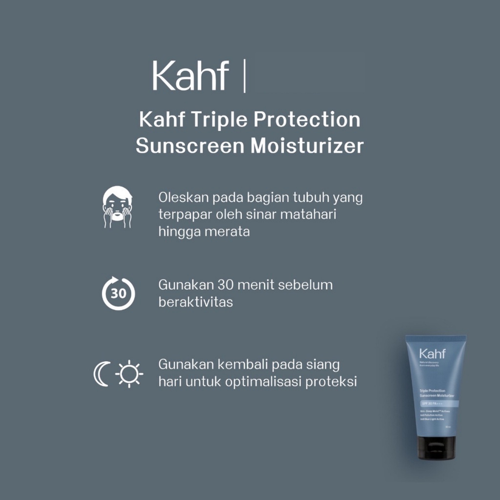 Kahf Triple Protection Sunscreen Moisturizer adalah pelembap wajah pria dengan tekstur yang ringan, mudah menyerap, serta tidak membuat kulit terasa lengket. Dilengkapi dengan Skin-Deep Moist™ Actives yang dapat memberikan kelembapan pada kulit serta kadar SPF 30 & PA +++ yang dapat memberikan perlindungan pada kulit dari paparan sinar matahari berlebih dan polusi. Diperkaya dengan ekstrak Japanese Mugwort mampu menjaga kulit dari radiasi sinar Blue Light yang dipancarkan dari perangkat digital. Ukuran: 30 ml