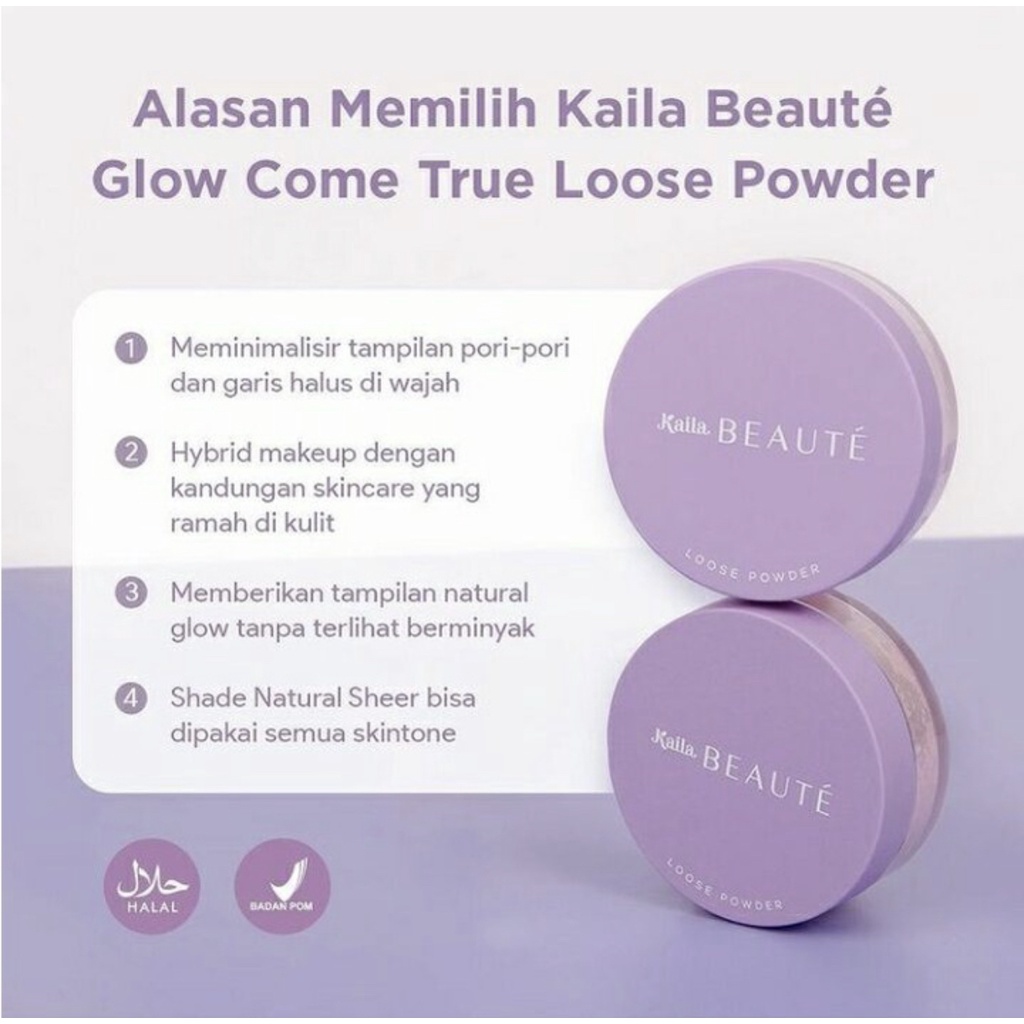 Kaila Beauté Glow Come True Loose Powder adalah bedak tabur dengan berbagai natural essences yang mampu menjaga kelembapan kulit sekaligus membantu mengontrol produksi sebum untuk mengunci riasan agar lebih tahan lama dan memberikan tampilan kulit yang lembut.