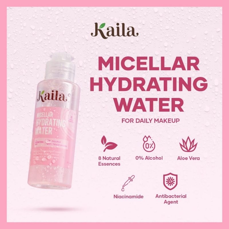 KAILA MICELLAR HYDRATING WATER Kaila Micellar Hydrating Water adalah cairan pembersih wajah tanpa kandungan alkohol, mampu membersihkan wajah dari debu dan kotoran, serta menghidrasi wajah secara alami. Diformulasikan dengan 8 natural essences yang membantu menutrisi wajah, Niacinamide yang membantu mencerahkan wajah, serta o-cymen-5-ol sebagai antibacterial agent untuk membantu melindungi wajah dari bakteri. 1. Gently Removes Makeup & Dirt Mengangkat kotoran dan makeup di wajah dengan lembut. 2. Hydrates and Nourishes Membersihkan sekaligus menghidrasi, menutrisi, dan melindungi kulit, sehingga kulit tetap terawat.