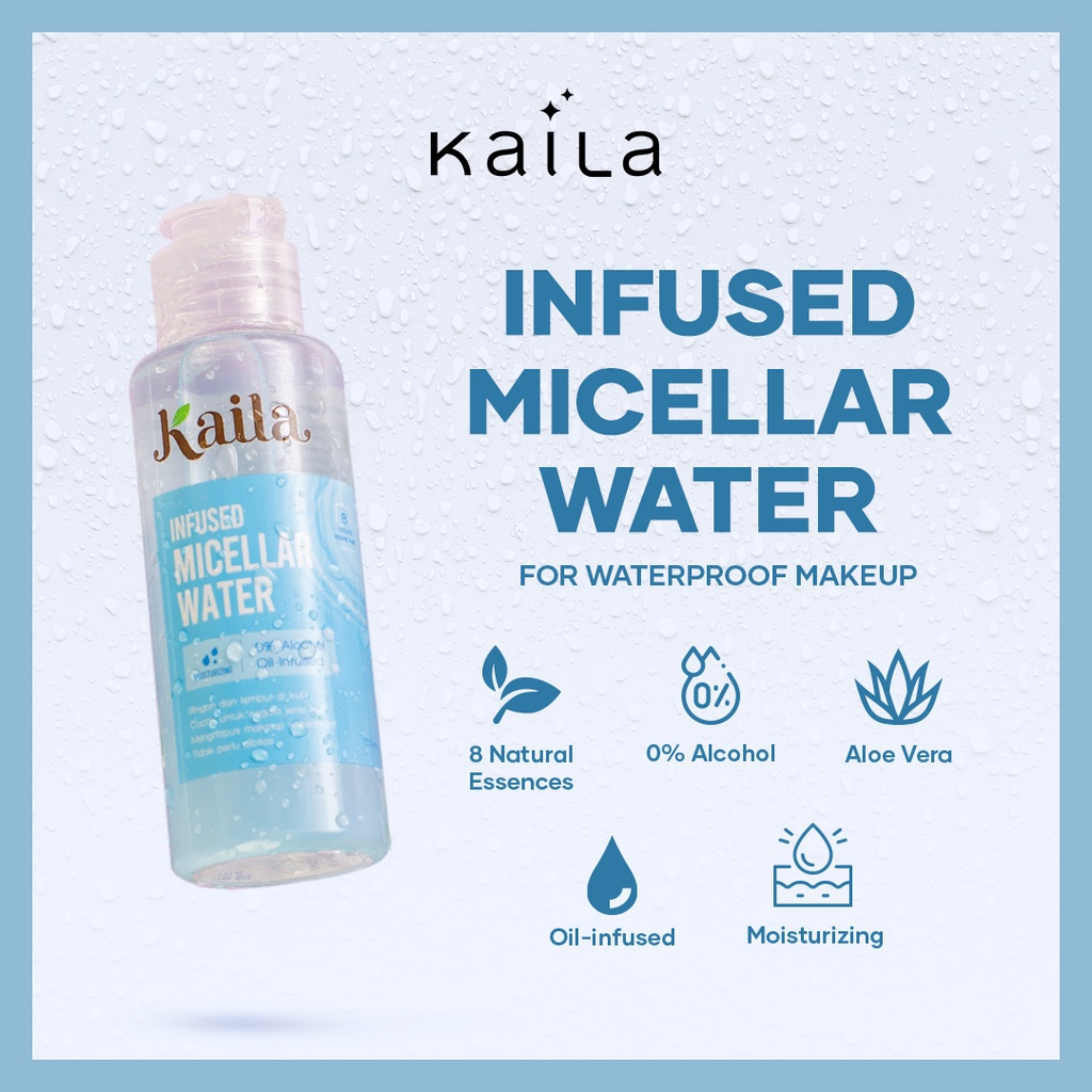 Kaila Infused Micellar Water adalah cairan pembersih wajah tanpa kandungan alkohol serta diformulasikan dengan 8 natural essences untuk membantu menjaga kelembapan dan kelembutan wajah, serta mampu membersihkan makeup waterproof, debu, dan kotoran yang menempel di wajah.