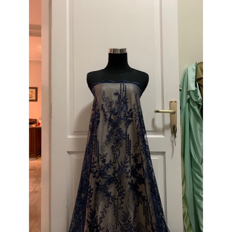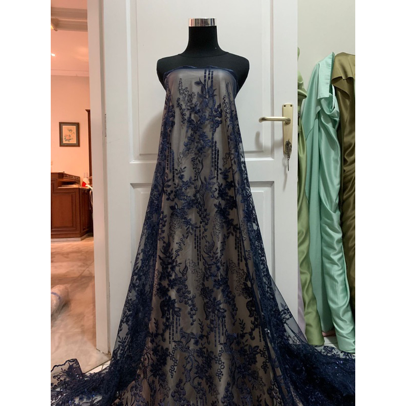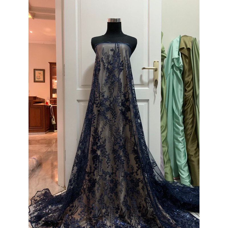 Detail Kain Bahan Kebaya Brokat Brukat Tile Bordir Payet Mewah Gracia Warna Blue Biru Navy