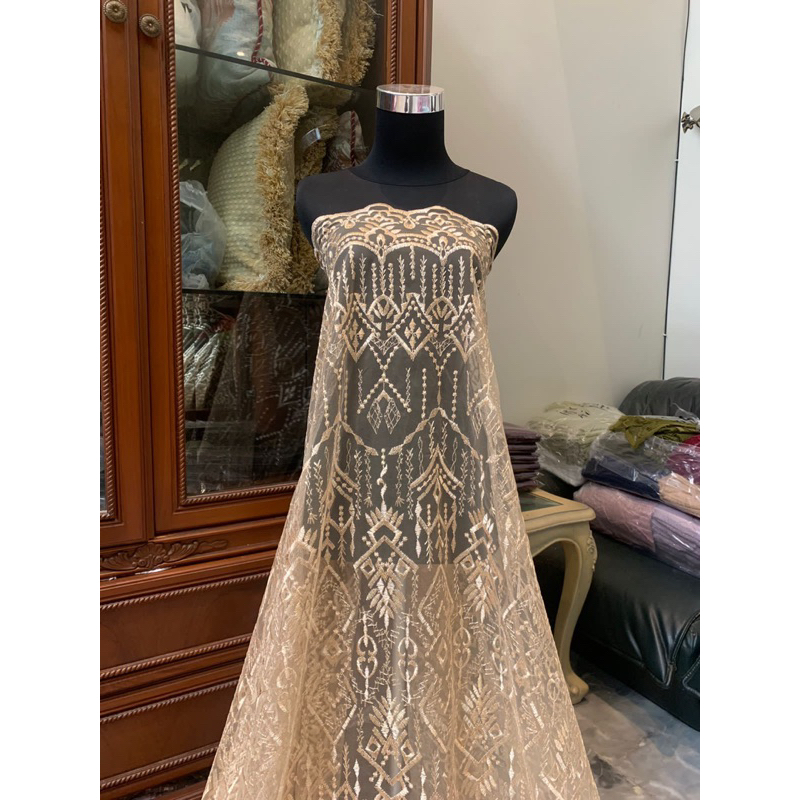 Detail Kain Bahan Kebaya Brukat Brokat Tile Tulle Bordir Mewah Etnik Madeline Warna Gold Emas Mas