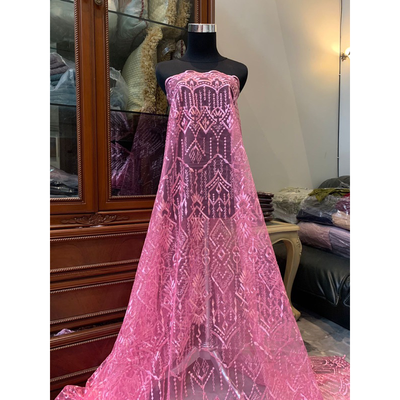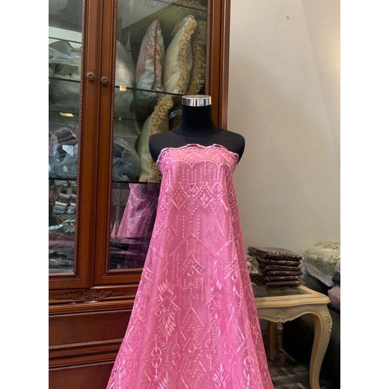 Detail Kain Bahan Kebaya Brukat Tile Bordir Mewah Etnik Madeline Warna Pink Merah Muda