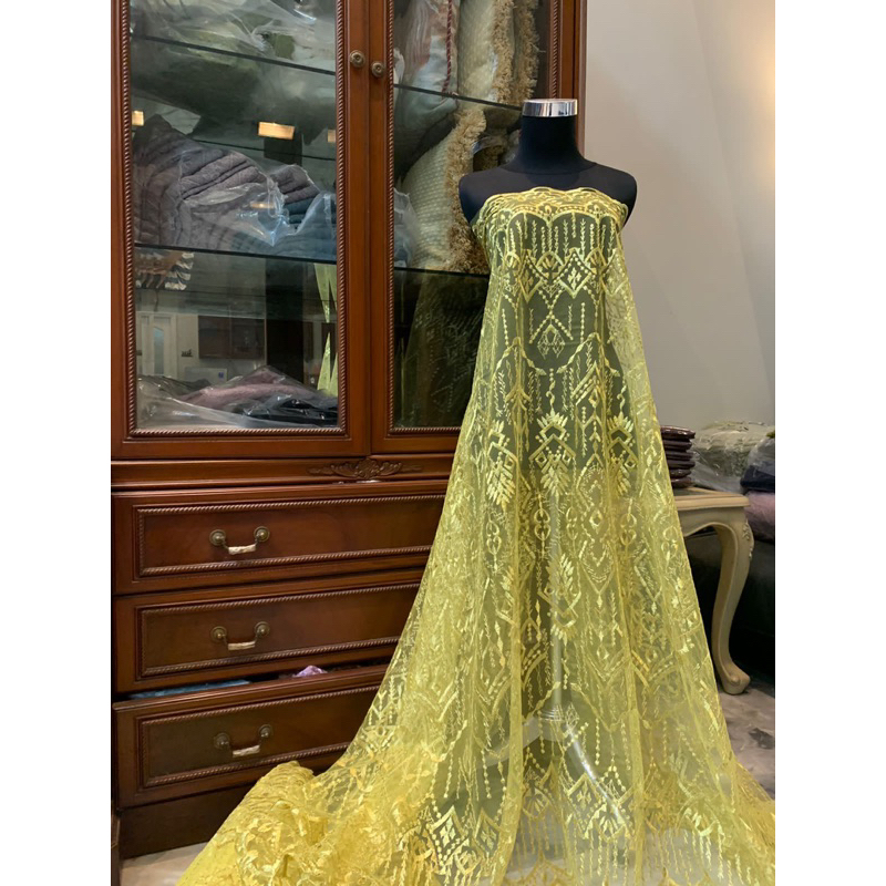 Detail Kain Bahan Kebaya Brukat Tile Bordir Mewah Etnik Madeline Warna Lemon Lime