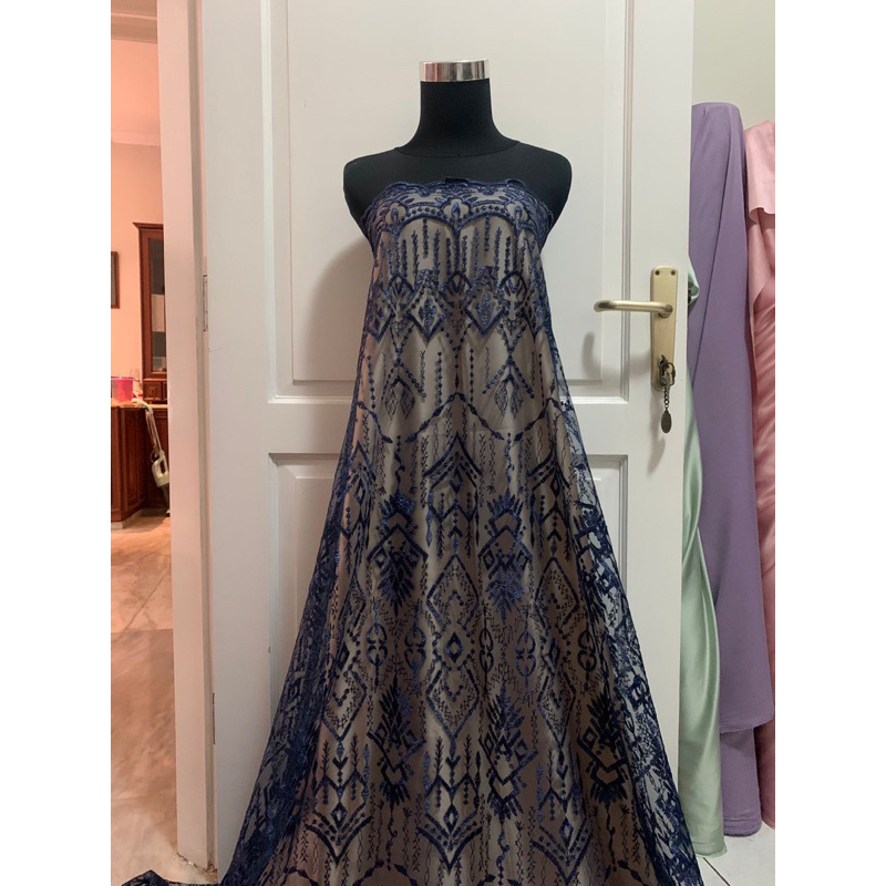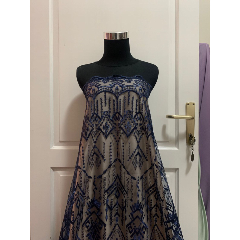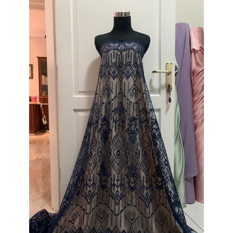 Detail Kain Bahan Kebaya Meteran Brukat Tile Bordir Etnik Madeline Warna Biru Navy Dongker