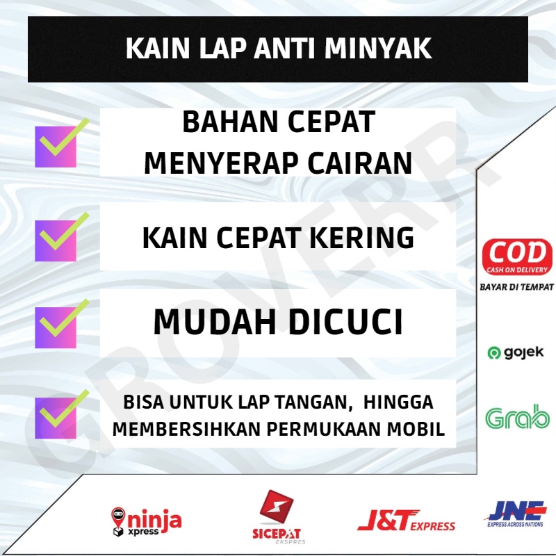 Fitur: 1. Kain Lap Anti Minyak ini dapat menempel debu-debu dengan kuat sehingga debu akan bersih dengan cepat dalam sekali usap dan tidak bertebaran kemana-man 2. Cocok digunakan untuk membersihkan dapur dan benda lainnya yang sedang dicuci. 3. Kain Lap Anti Minyak ini selain berguna membersihkan dapur juga dapat digunakan untuk membersihkan berbagai objek seperti meja, mobil, dinding, lemari, dll.