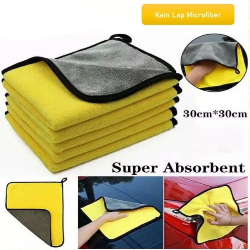 Kain lap dengan bahan microfiber yang sangat tebal, berpori-pori sangat rapat. Sangat mudah digunakan, menyerap air dan membersihkan kotoran yang menempel tanpa mengores permukaan. Sangat cocok untuk membersihkan permukaaan mobil, motor, pegangan tangga stainless, dan lainnya alias serbaguna.