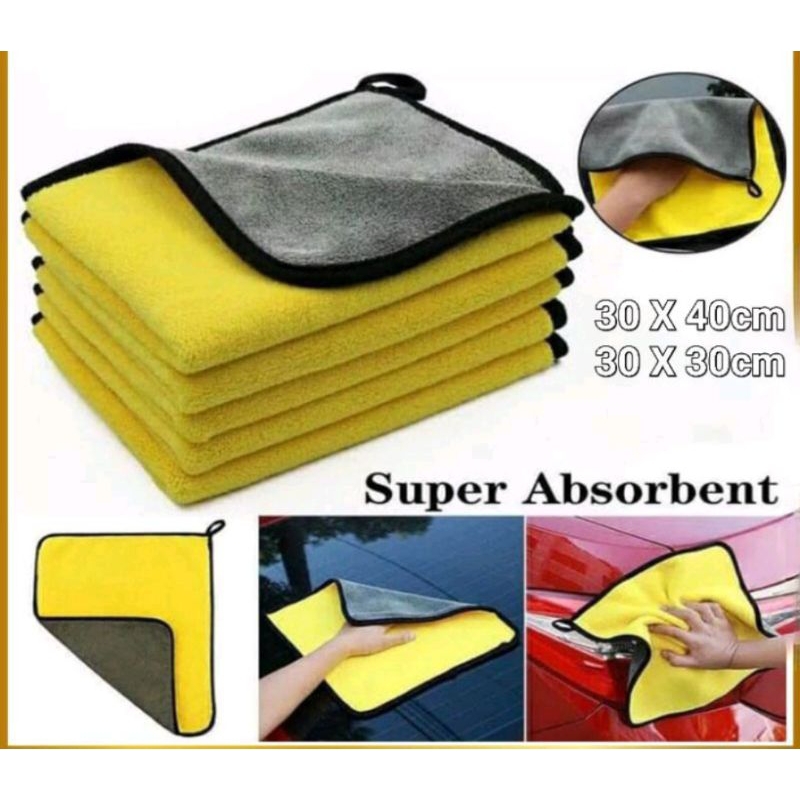 Kain lap dengan bahan microfiber yang sangat tebal, berpori-pori sangat rapat. Sangat mudah digunakan, menyerap air dan membersihkan kotoran yang menempel tanpa mengores permukaan. Sangat cocok untuk membersihkan permukaaan mobil, motor, pegangan tangga stainless, dan lainnya alias serbaguna.