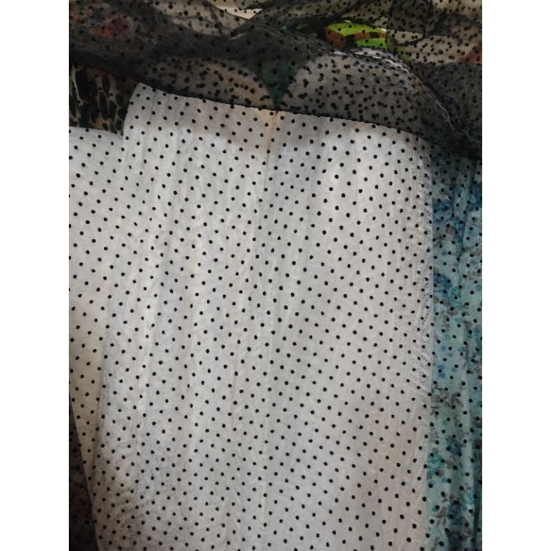 Jenis bahan : organza totol hitam Lebar : 150 cm Tekstur : โ Kain sedikit kakuโ bahan tembus pandang โ bahan import