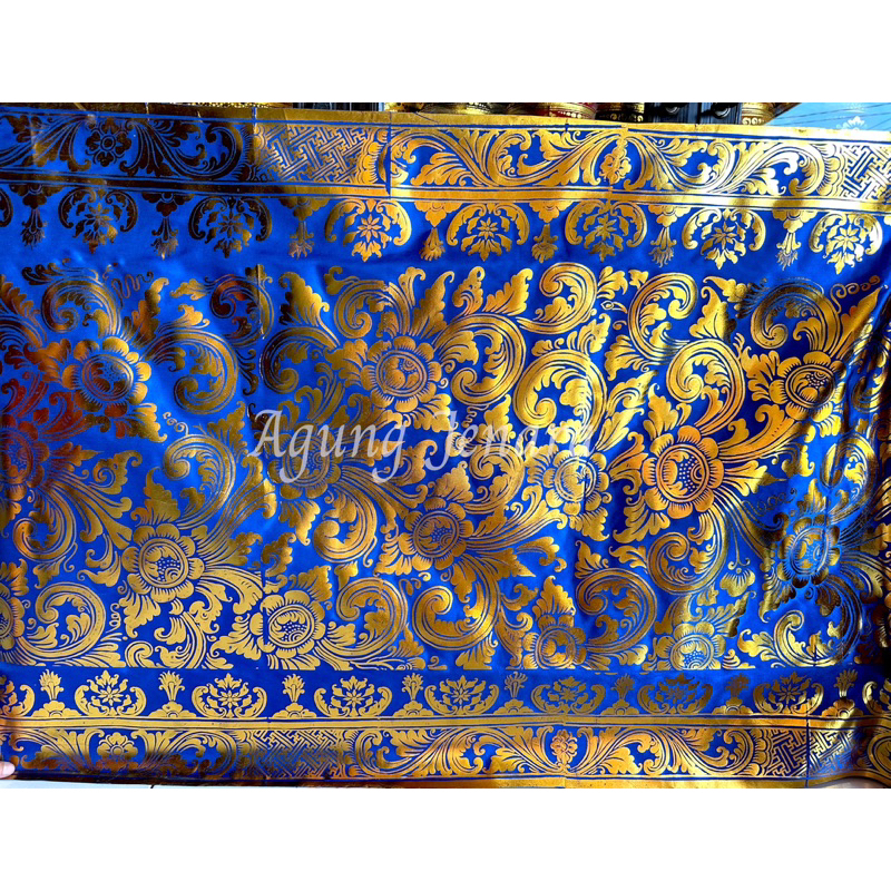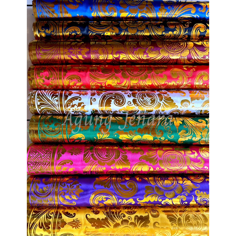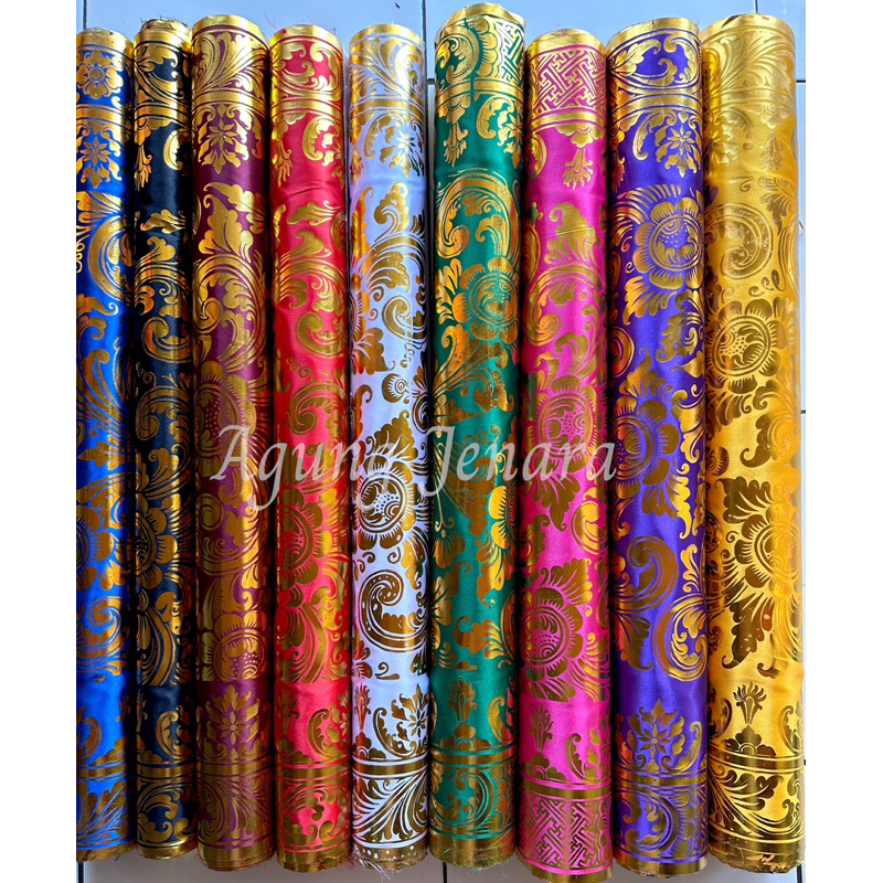 Lebar kain 90cm, mengikuti pesanan. Bahan kain satin dengan motif tinta warna emas prada.
