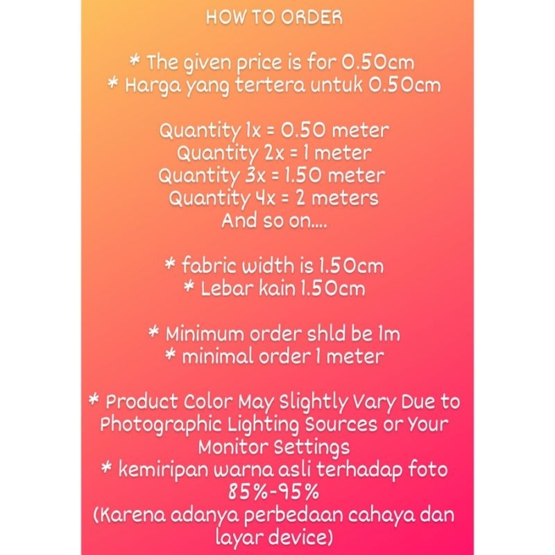 * mohon membaca deskripsi produk dengan hati hati karena kain yang sudah di beli tdk dapat di kembalikan ataupun tukar.