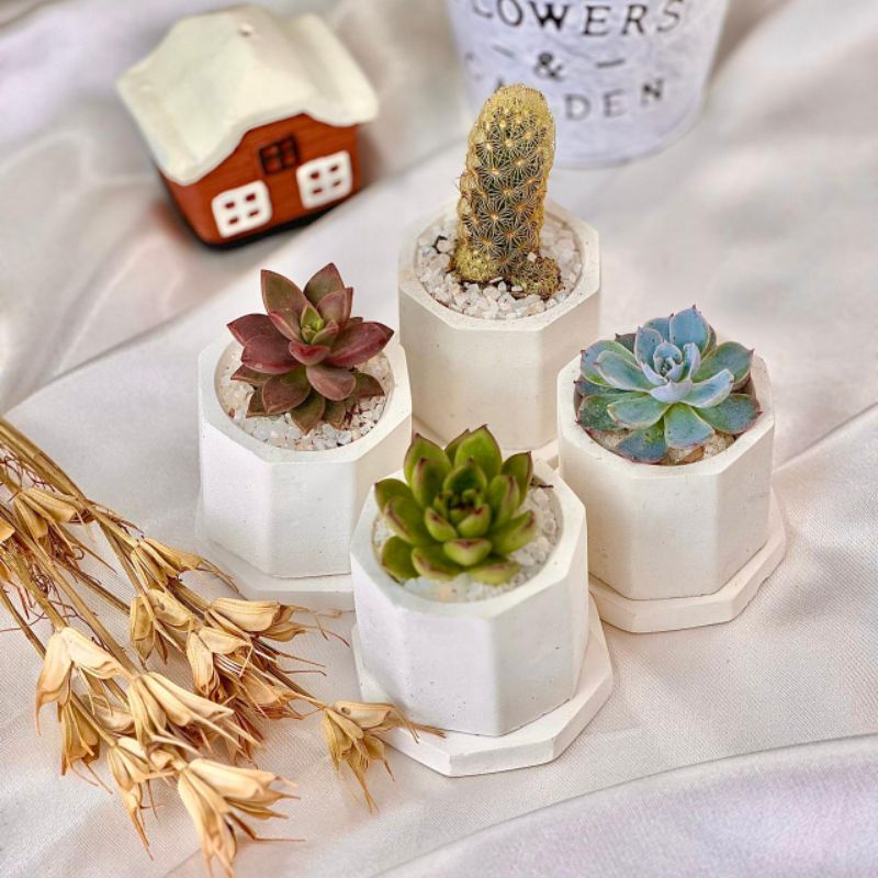 Notes: Pot semen/plastik mini dan kaktus sukulen 1 set tanaman kaktus dan sukulen terdiri ; *pot semen diameter 5,5cm, kaktus atau sukulen (tanaman bebas pilih kaktus atau sukulen ketika chekout) , metan secukupnya,batu
