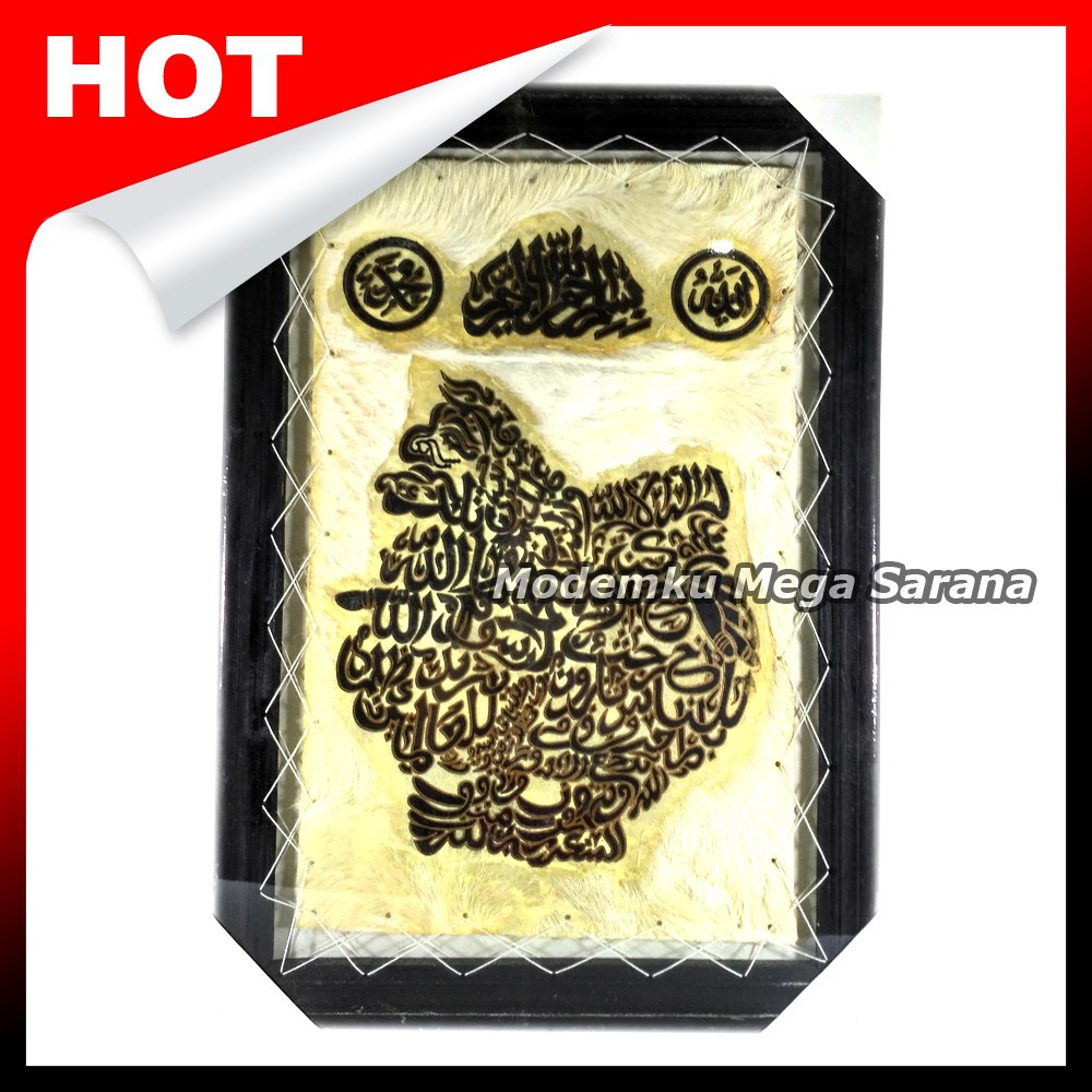 Kaligrafi Surat Ali Imron Semar Kulit Kambing L 70x50 cm - Bingkai Hitam merupakan kaligrafi dengan ukuran bingkai 70 x 50 cm, terbuat dari bahan kulit kambing yang dilapisi plastik transparan. Ideal untuk dijadikan sebagai hiasan dinding ruangan Anda serta diberikan sebagai souvenir atau hadiah. Tulisan menggunakan warna hitam kombinasi emas, memberikan kesan eksotik. Kulit dengan tulisan Arab ini dibingkai dengan kayu yang dicat hitam kecoklat-coklatan, benang putih digunakan untuk mengaitkan kulit pada bingkai.