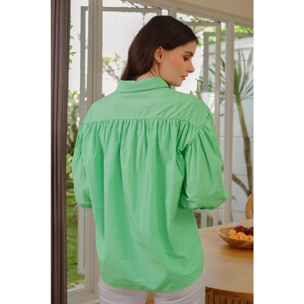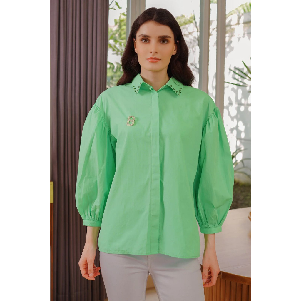 This shirt boasts a minimalistic yet elegant design. Crafted in a loose-fit silhouette with ultimate versatility and comfort. Features pleated sleeves that are subtly puffed. It's punctuated with a studded wide collar to lend your casual curations a glamorous finish.