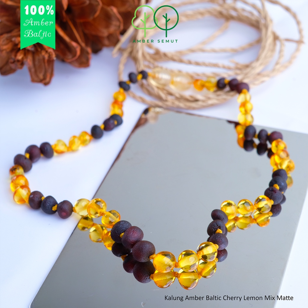 Shaping/Bentuk: Bulat (Baroque), Chips, Nuggets -> [Tergantung pilihan Anda] Jenis tali: Nylon (sangat kuat, meminimalisir putus saat dipakai) Sistem tali/; Ikat mati tiap butir amber Berat: 5-7 gram (sangat ringan, membuat anak nyaman memakainya) Diameter Butir: 5-8 mm