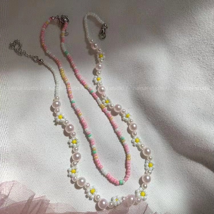 Detail Kalung Manik-Manik Merah Muda Set Perempuan Musim Panas Manis Warna-Warni Bunga Klavikula Rantai Set