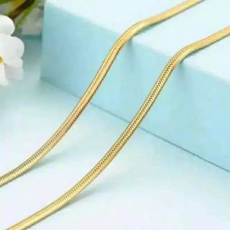 Kalung bahan titanium Steenles steel 313 Ready warna Silver dan Emas Ukuran kalung ready: Panjang 45cm, 50cm dan 60cm Lebar kalung ready ukuran: Sedang 1,2mn Besar 1,5mm Kalung gepeng pria dan wanita murah Ready stock siap kirim