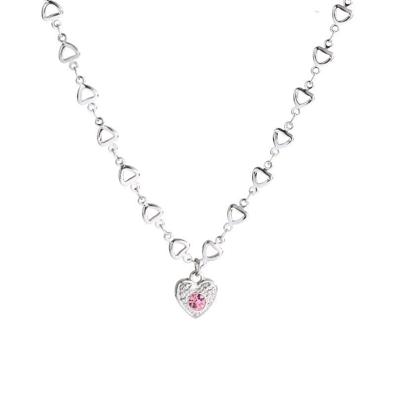 Detail Kalung Rantai Desain Hati Aksen Berlian Warna Pink Untuk Wanita