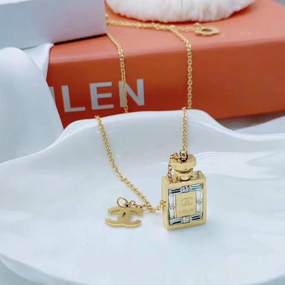 Detail Kalung Rantai Klavikula Bahan Titanium Stainless Steel Bentuk Botol Parfum Aksen Berlian
