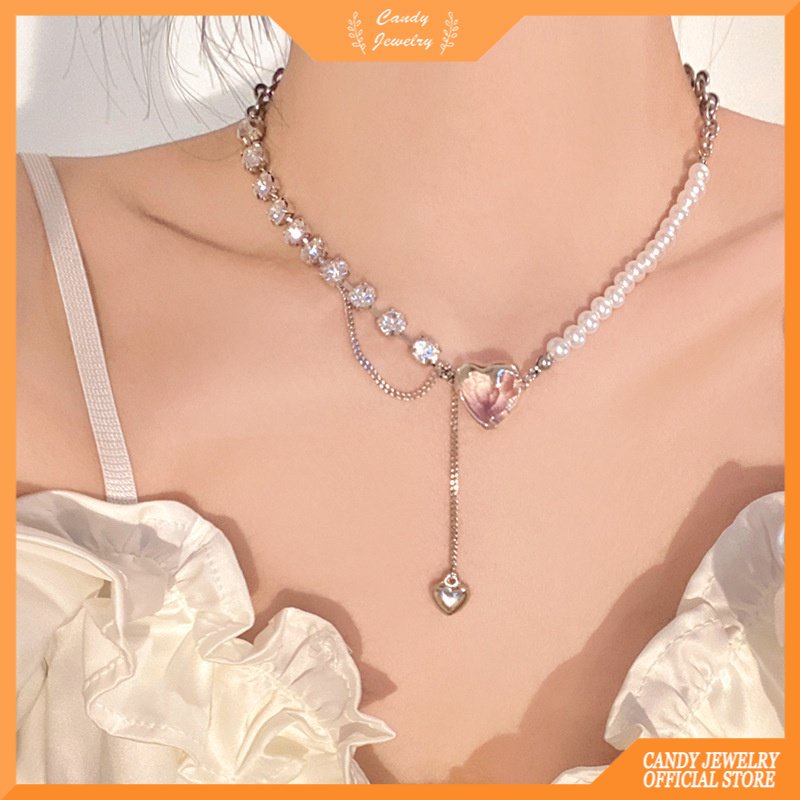 Detail Kalung Rantai Klavikula Desain Barbie Mutiara Zirkon Warna Pink Untuk Wanita