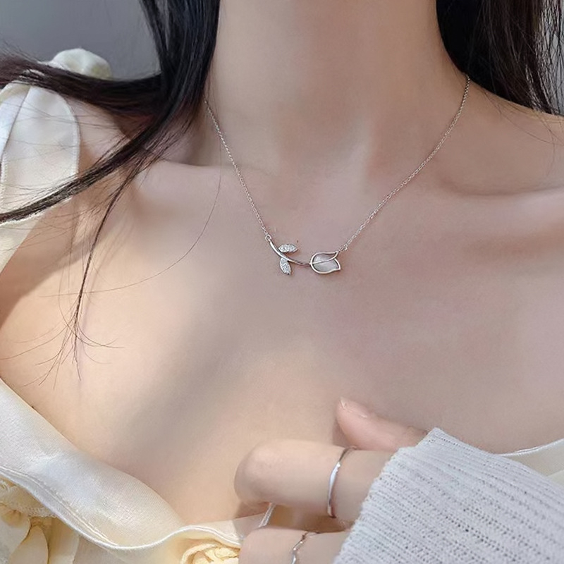 Detail Kalung Rantai Klavikula Hias Liontin Bunga Tulip Opal Berlian Gaya Retro Untuk Wanita