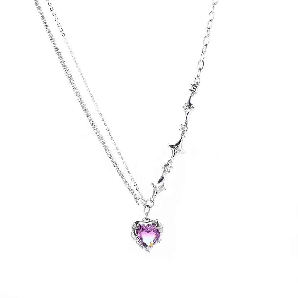 Detail Kalung Rantai Klavikula Hias Liontin Hati Berlian Ungu Untuk Wanita