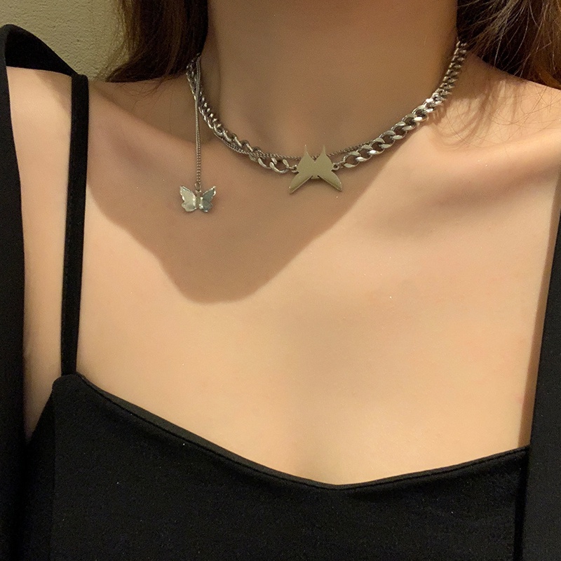 Detail Kalung Rantai Klavikula Model Double Layer Desain Kupu-Kupu Bahan Metal Gaya Hip Hop