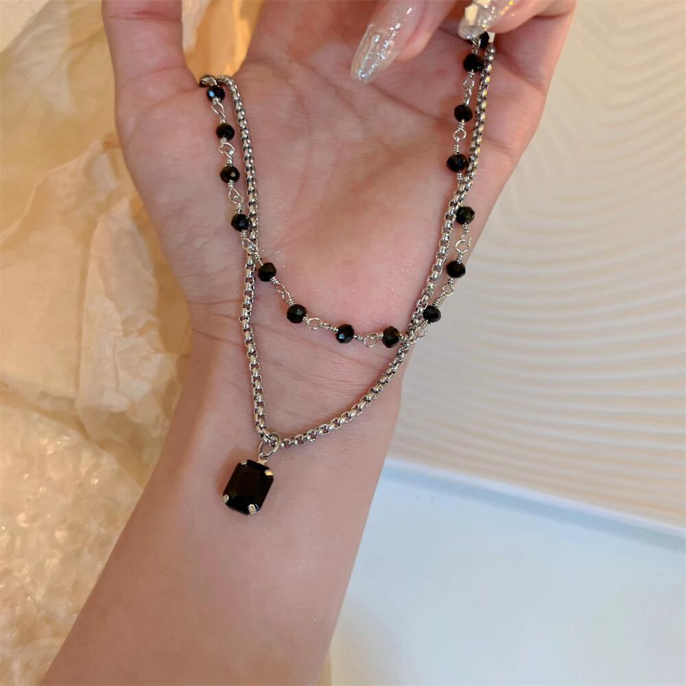 Detail Kalung Rantai Klavikula Model Lapis Ganda Aksen Manik-Manik Warna Hitam Gaya Korea Untuk Aksesoris