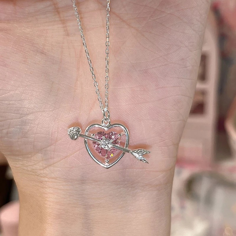 Detail Kalung Rantai Liontin Hati Panah Cupid Hias Berlian Warna Pink Untuk Wanita