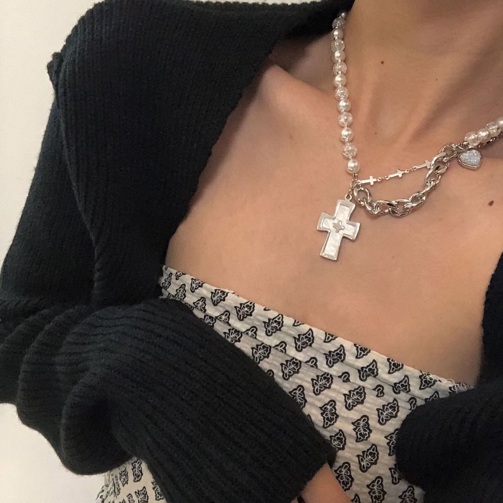 Detail Kalung Rantai Liontin Salib Hias Mutiara Imitasi Ala Hiphoppunkeropaamerika Untuk Wanita