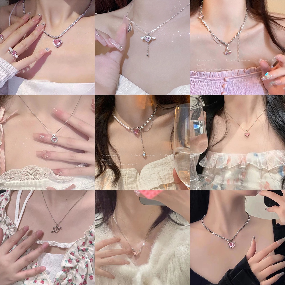 Detail Kalung Rantai Permata Pink Mewah Untuk Wanita Elegan Zirkon Jantung Liontin Aksesoris Perhiasan