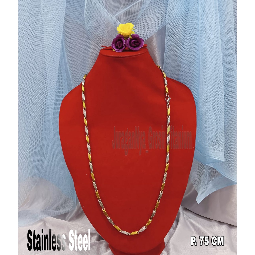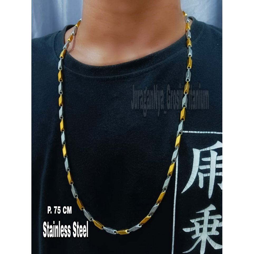 > JENIS : Kalung Titanium > MODEL : No Brand > MEREK : Tidak bermerk > GAYA : PRIA > WARNA : KOMBINASI > SIZE : kalung p.50,75cm > BAHAN : STAINLESS STEEL Titanium 💯% 2. KEUNGGULAN
