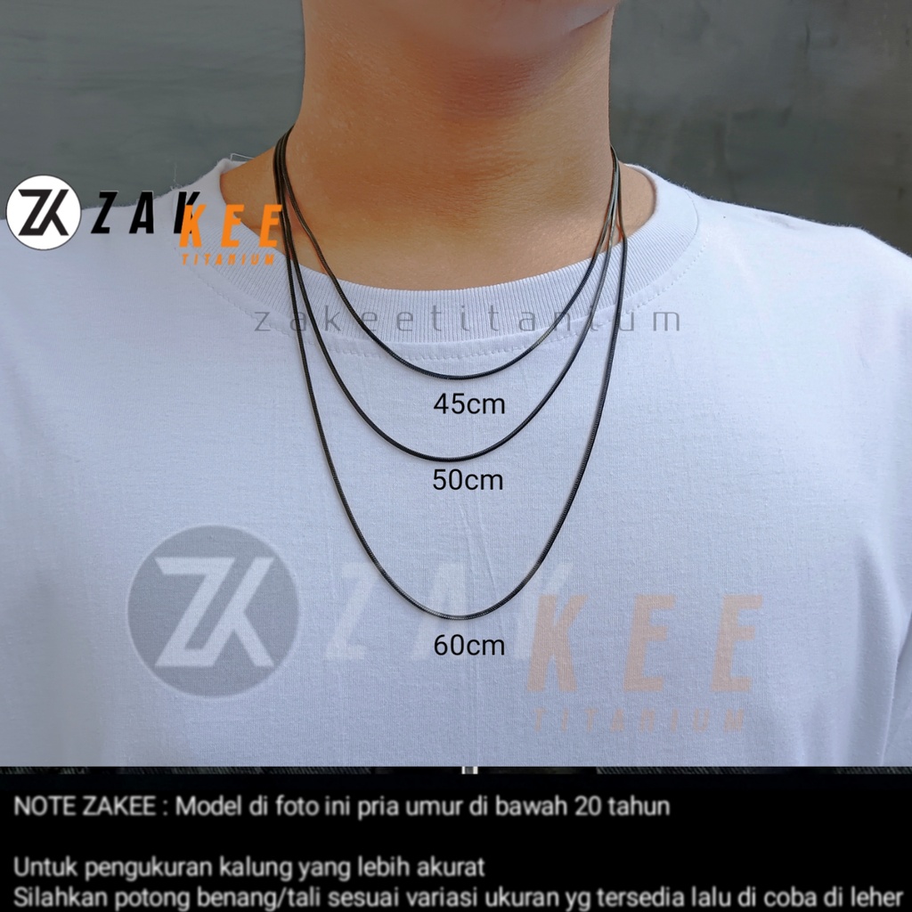 • Bahan kalung: Titanium steel 316L • Warna kalung: Hitam • Model kalung: kotak Simpel • Panjang kalung: 45cm, 50cm, 60cm • Lebar kalung: 1,5mm