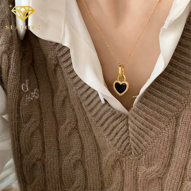Detail Kalung titanium wanita anti karat emas liontin hitam dan putih dua sisi perhiasan Korea