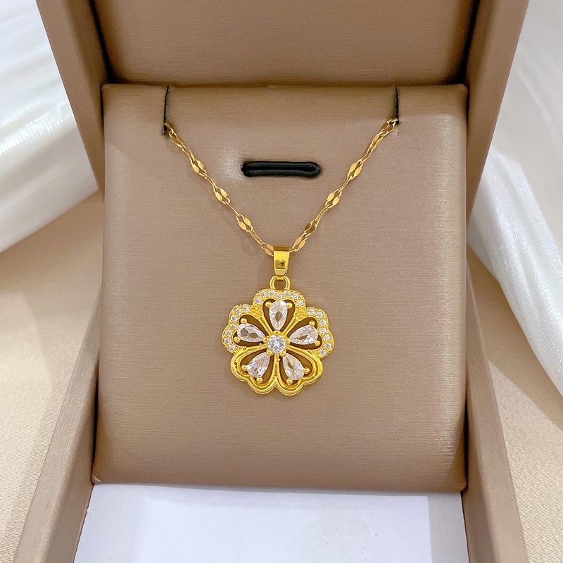 Detail kalung titanium wanitat Full Diamond Flower Pendant Chain Titanium kalung