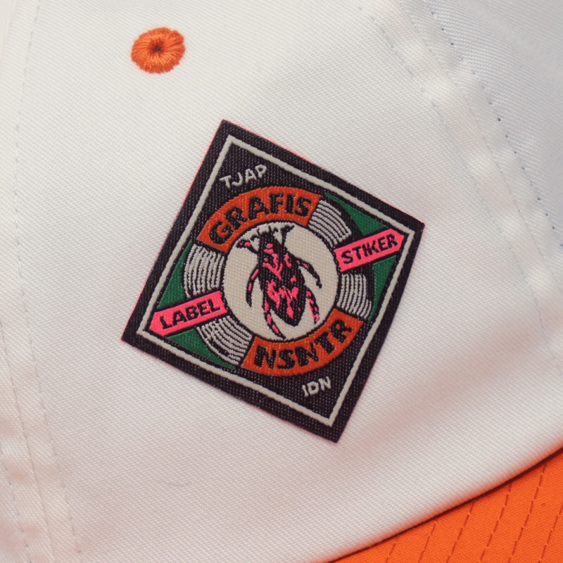 @grafisnusantara. Material : Cream and orange cotton twill, small visor, with woven press graphic. One size fits all with adjustable strap, bonus corona finger or keychain ( random color and shape )